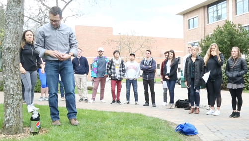 Figure 1 shows a typical Mentos-and-soda test in action, with Dr. Stelling conducting the experiments and students recording the results.